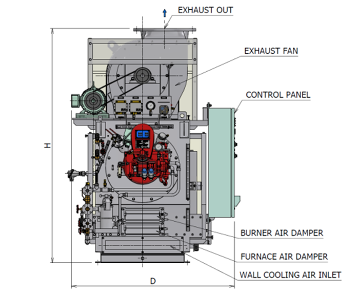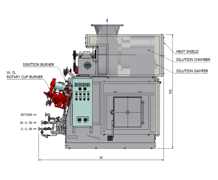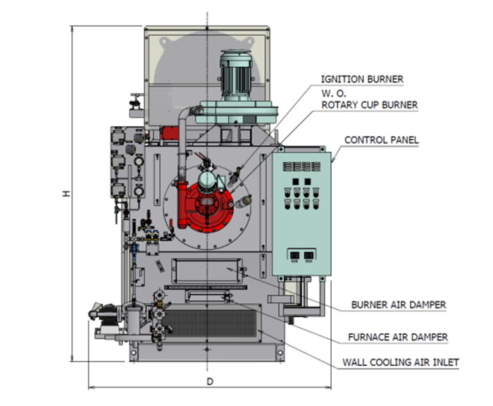 Rotary cup burner installed on all models; ideal for atomizing low quality fuels with high viscosity.